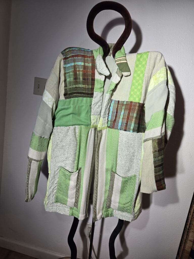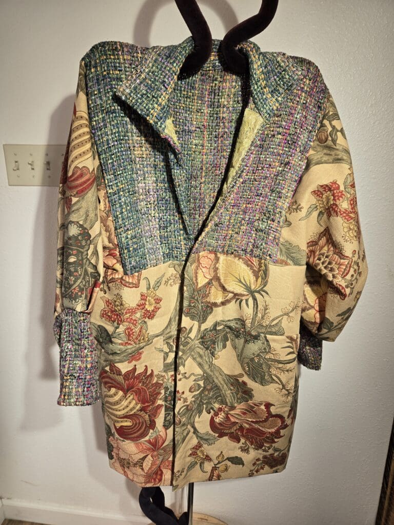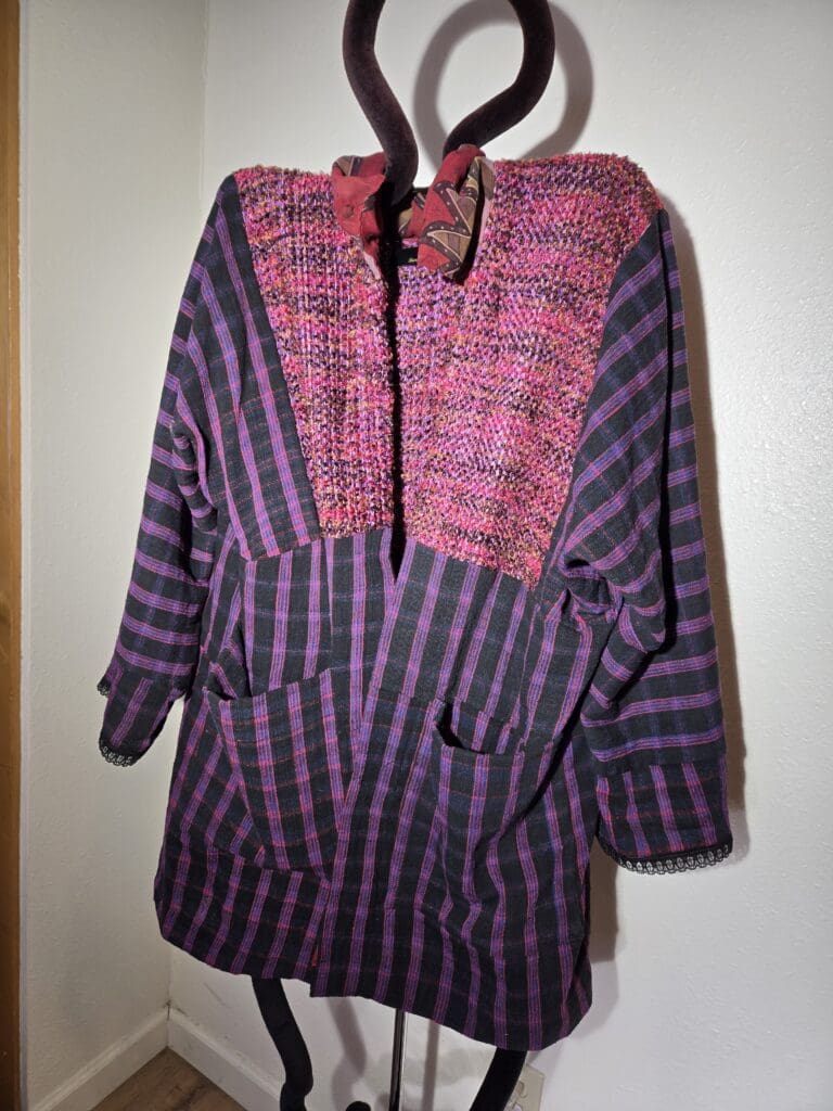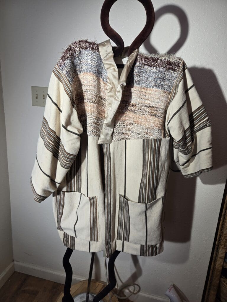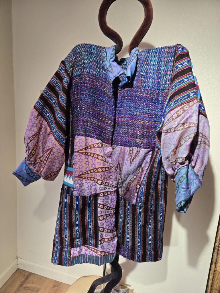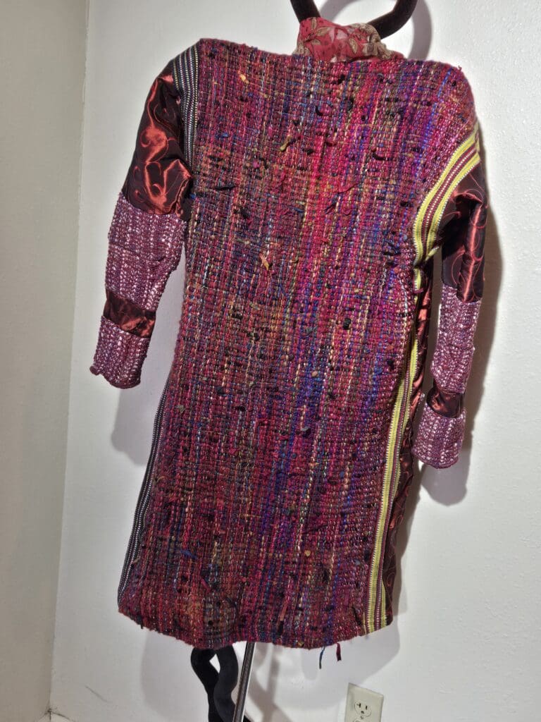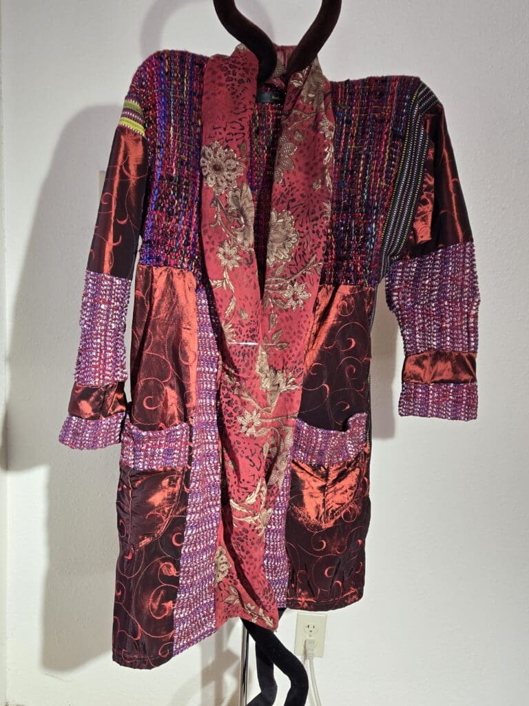 This collection includes jackets and coats that are created through sewing, serging, and mixing fabulous fabrics with Barbara’s own weavings. From custom tailoring to intricate fiber details, these pieces reflect a deep commitment to slow fashion, personal expression, and timeless design.